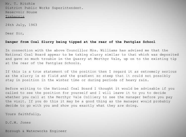 In the case of Aberfan multiple significant suspicions and concerns were raised about Coal Tip 7 collapsing upon the village, and primarily upon Pantglas Junior High School. Several pit accidents had occurred prior to 21 October 1966, including a slip in 1963 that stirred a petition from the school itself, and slurry would often run down the mountainside and block drains in surrounding streets. All these warnings were evidently ignored. Additionally, the tip was essentially built upon natural springs that went against guidelines and compounded the liquefaction of the coal waste, whilst others remained silent about their concerns due to a fear of unemployment (‘make a fuss = close the mines’).