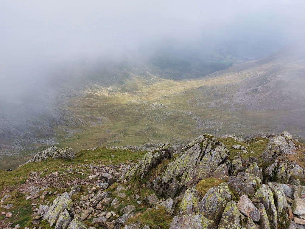 I tethered along the ridge line and passed through Buck Pike + Dow Crag, with the latter being the most technically challenging + dangerous part of the hike whilst in the clouds. When I reached Dow Crag, I realised that it was going to be a technical challenge and I just had to continue + enjoy it all at the same time. I could see why the couple were shook and decided to return, but all I did was remain to the left of the path where the relief was gradual and this kept me safe.
