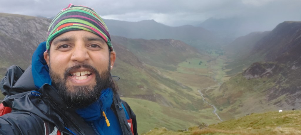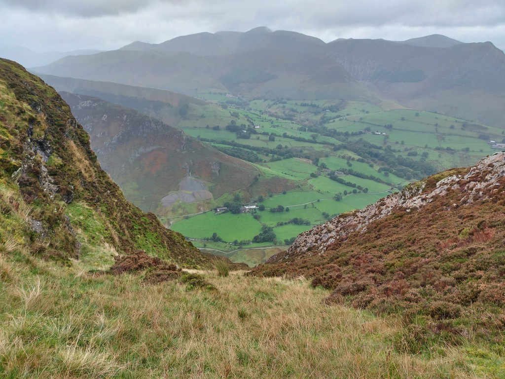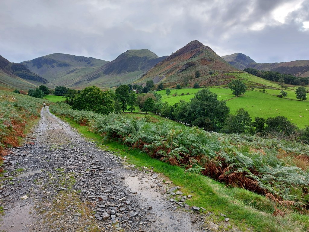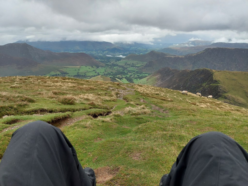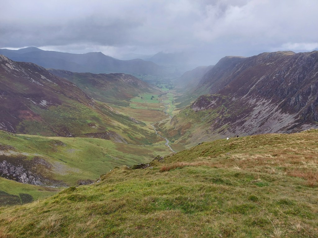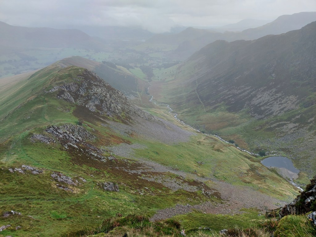 When I began to descend Robinson into Newlands Valley, the panorama had all this and more. I could see far into the distance of the Lake District ahead of me, towards the Northern Fells and more. The rain briefly returned RIGHT at the very moment I had to scramble down a couple of crags – there was no way I was going to walk down them, but it was fun + went well!