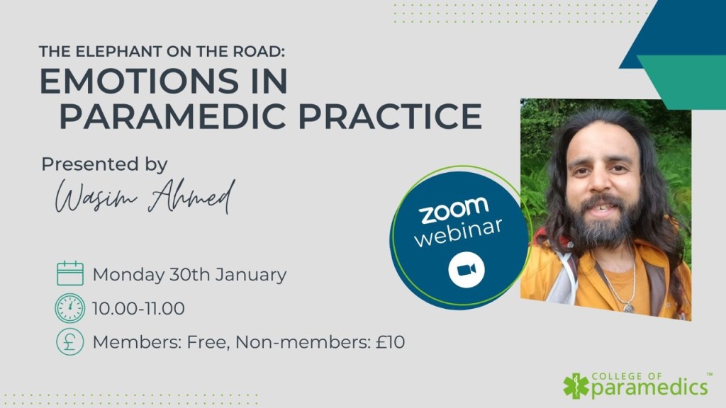 College of Paramedics UK members can access the recording of my webinar by following this link: https://collegeofparamedics.co.uk/COP/CPD/CPD_Items/The_Elephant_on_the_Road_Emotions_in_Paramedic_Practice.aspx